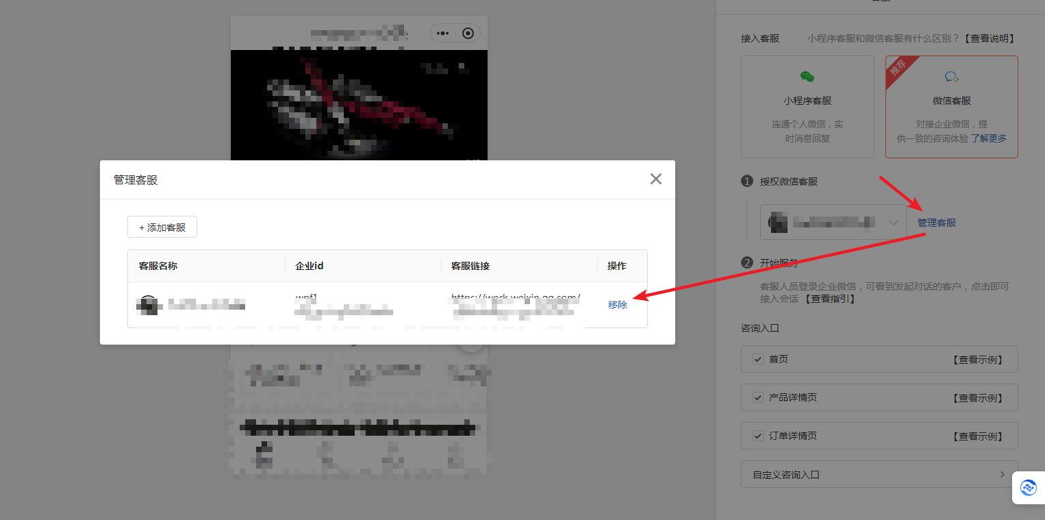 2、商城小程序设计页面,在客服控件中,移除已添加的客服