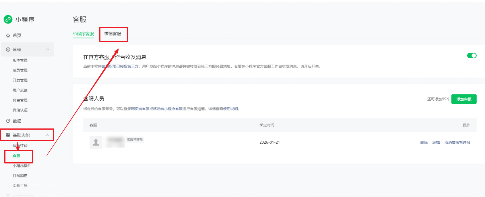 1、登录微信小程序管理后台https://mp.weixin.qq.com--进入客服设置页面,取消当前接入;