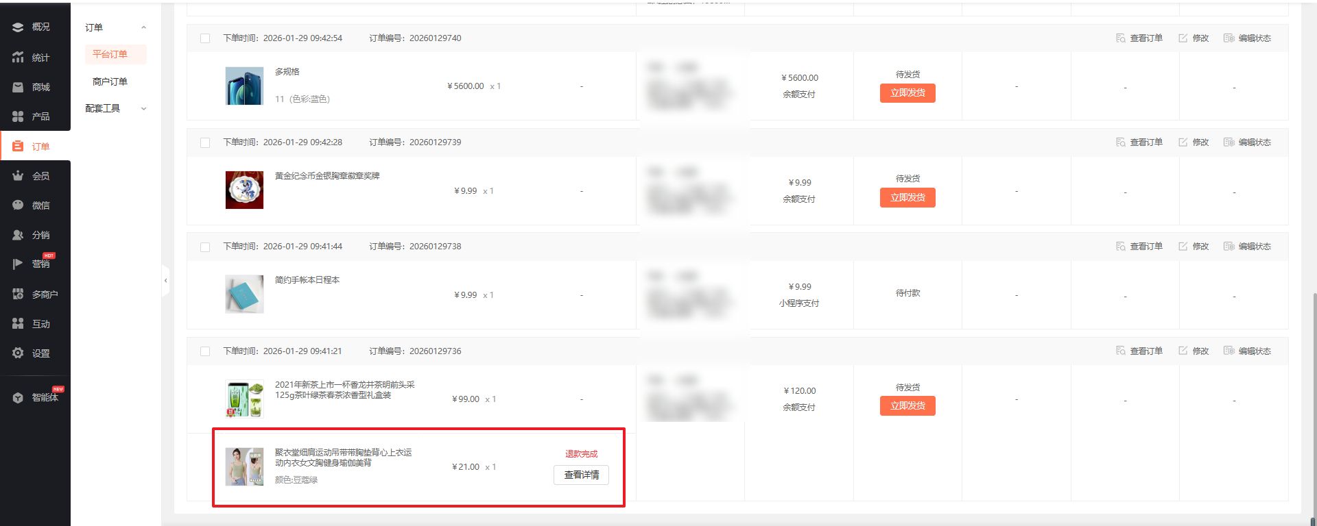 ② 若该功能已开启,需在商城后台「订单管理该功能已开启,需在商城后台「订单管理」中排查待发货、已发货、交易完成的订单:先在表格里筛选出待发货且有退款金额的订单,记录订单号,再回后台搜单号核实是否为部分退款。