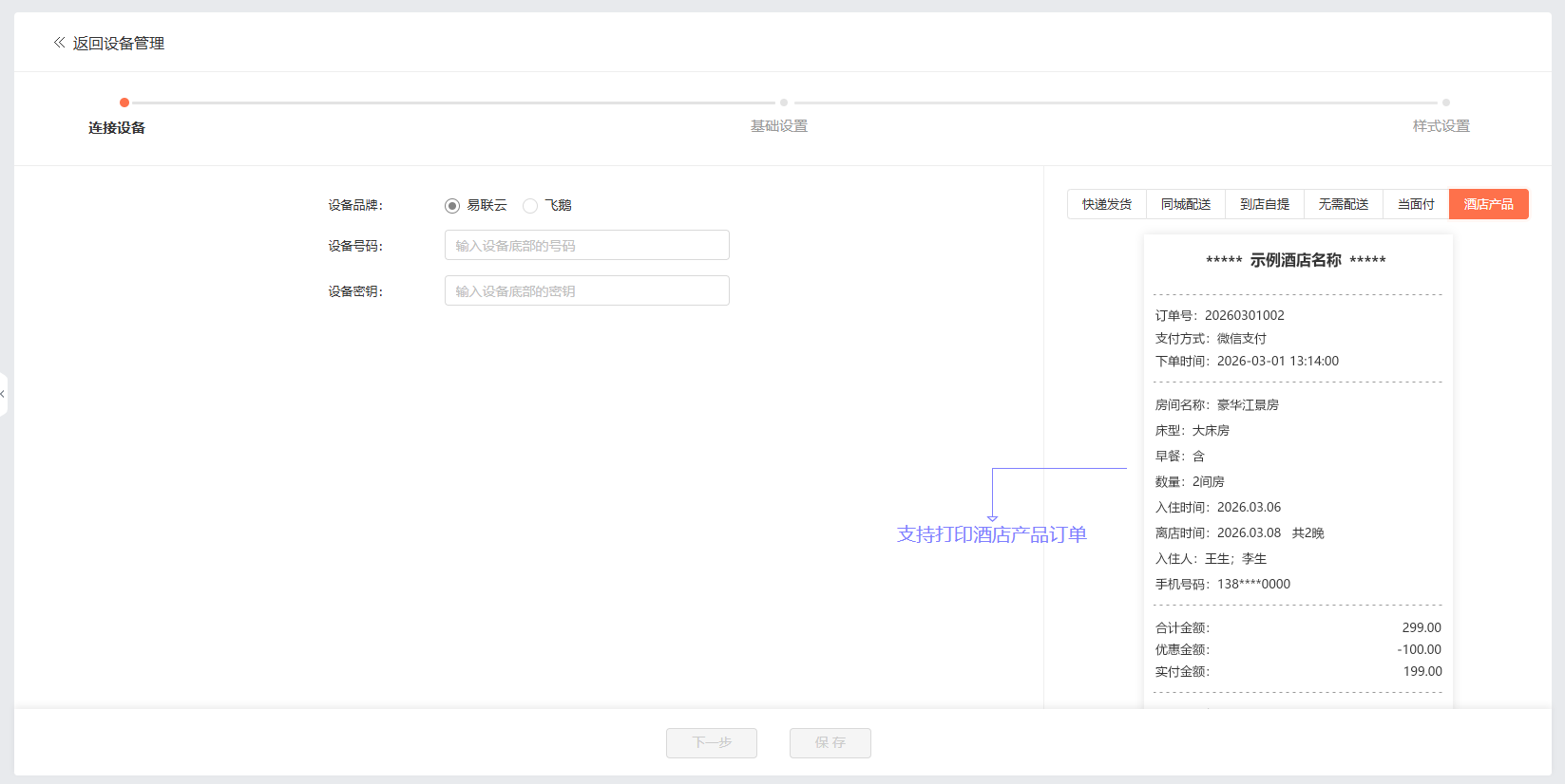 新增支持打印酒店产品订单小票