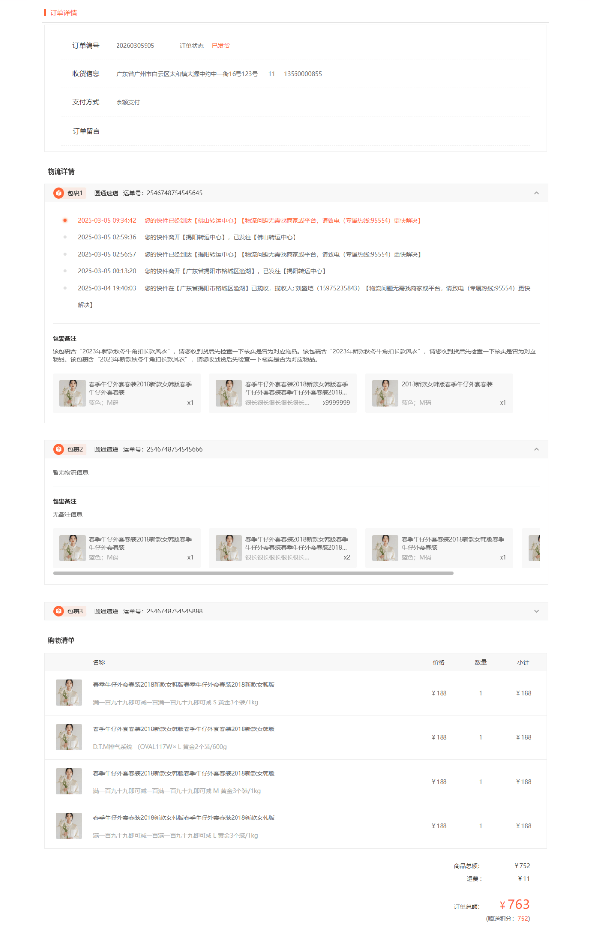商家对快递发货订单进行拆单发货后,电脑商城支持同步展示多个包裹的产品信息、包裹备注和物流信息