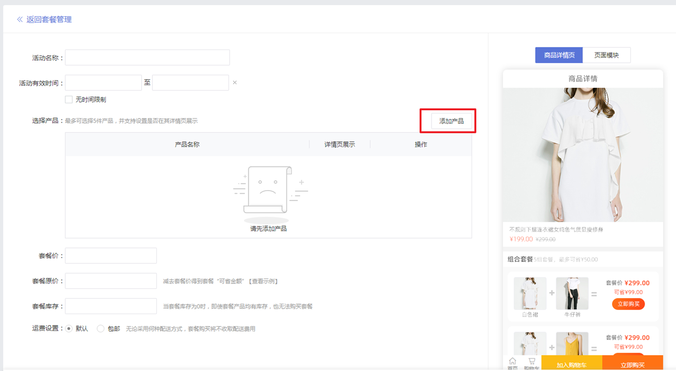 开启功能后,点击“新增活动”按钮,进入活动创建页面,选择活动产品,填写活动规则。