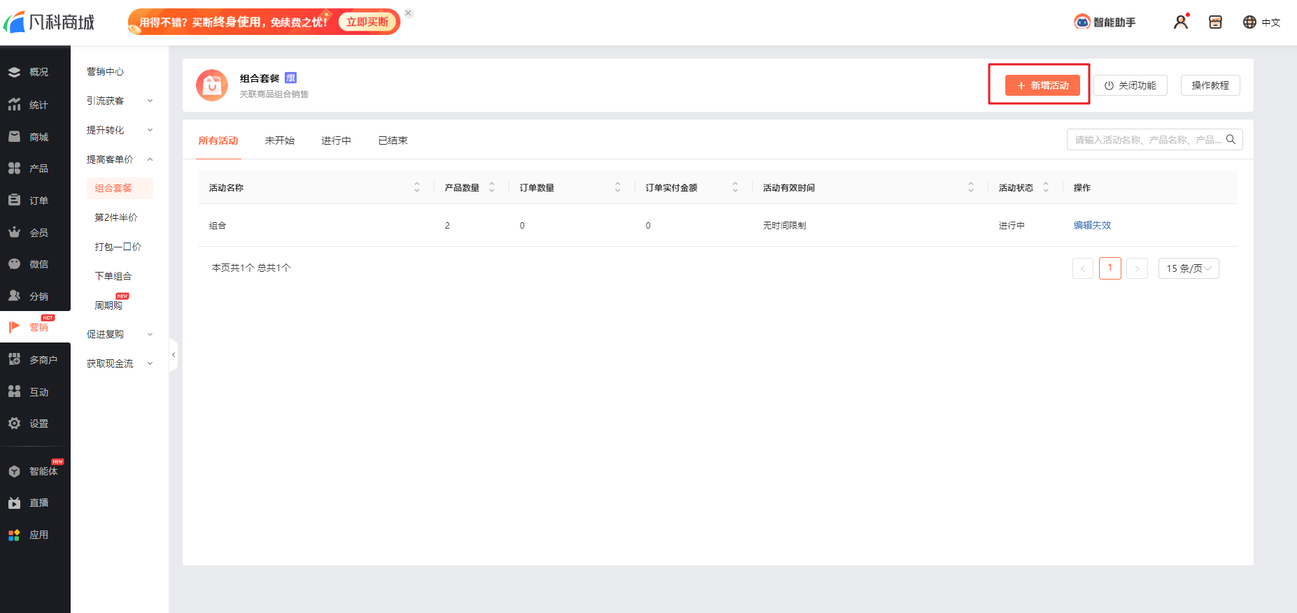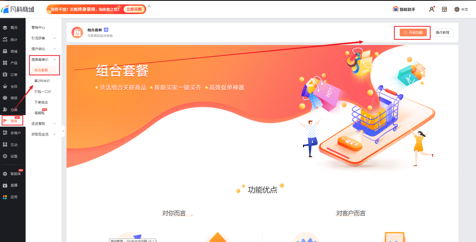 进入【商城管理-营销-提高客单价-组合套餐】中,可开启组合套餐功能。