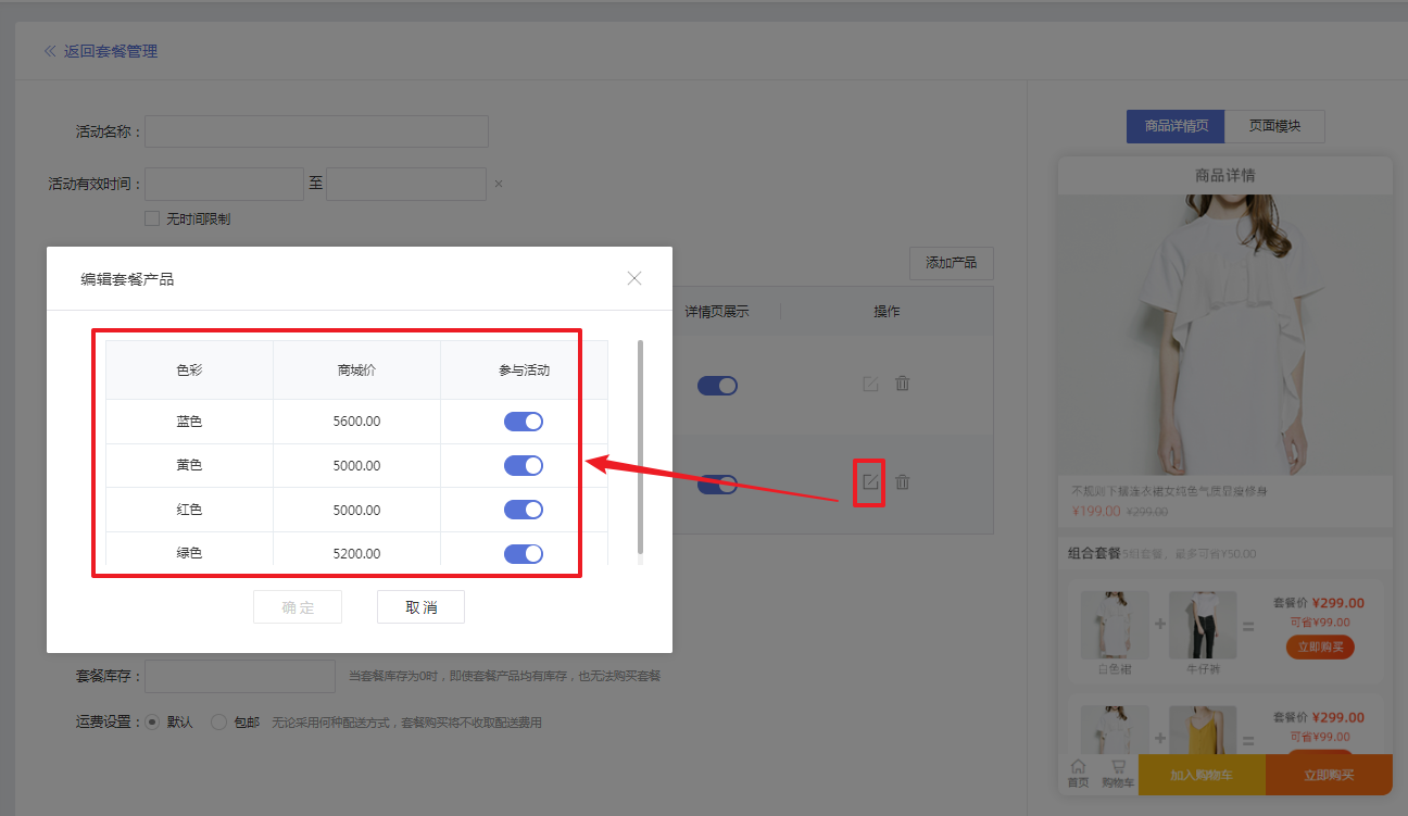 ③ 点击“编辑”按钮,可编辑套餐产品的购物选项。