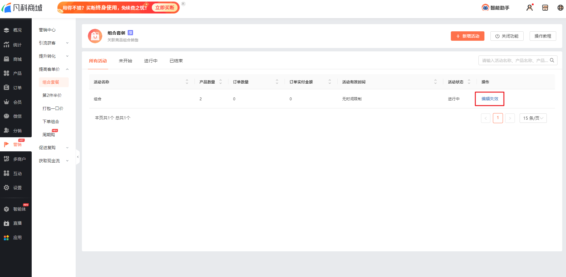 所有活动列表中展示所有已创建的组合套餐活动,支持对活动进行“编辑、失效”操作。