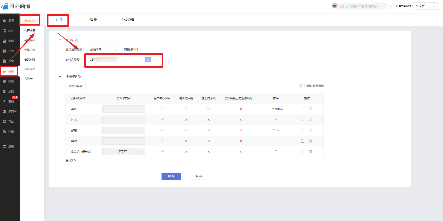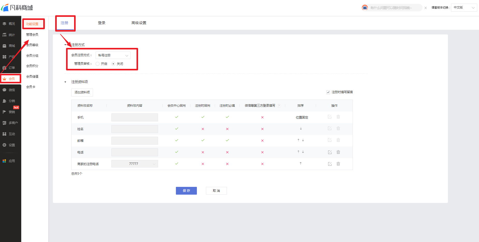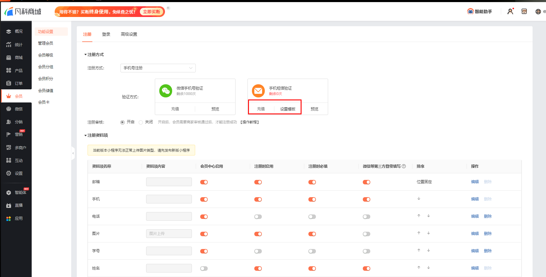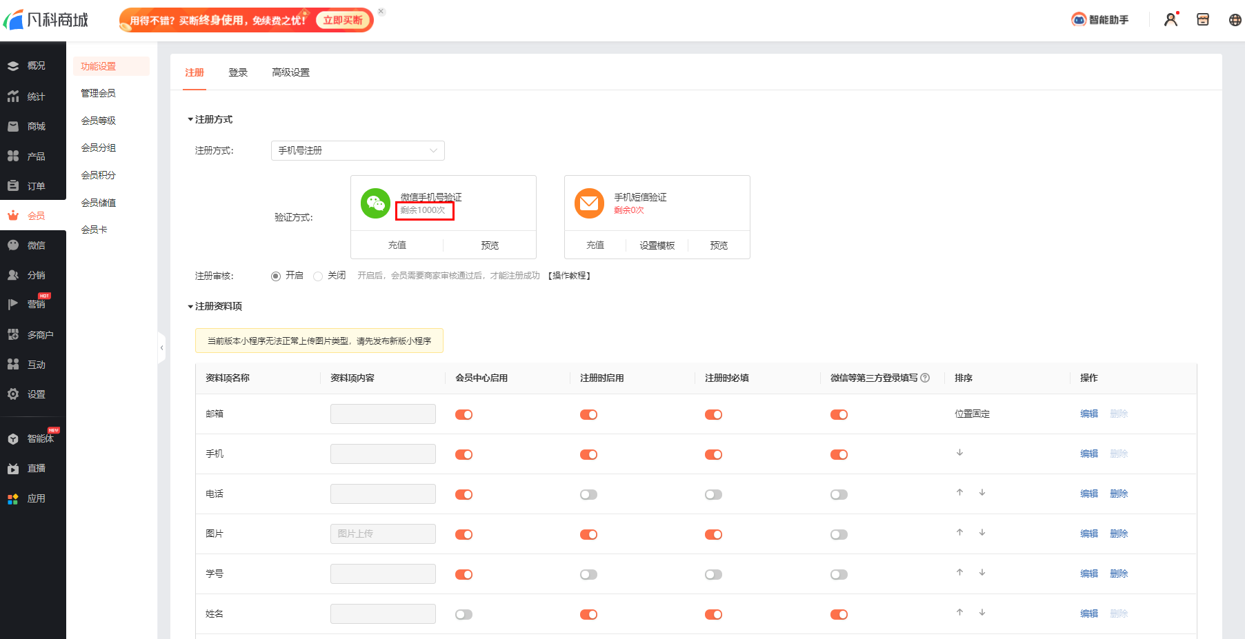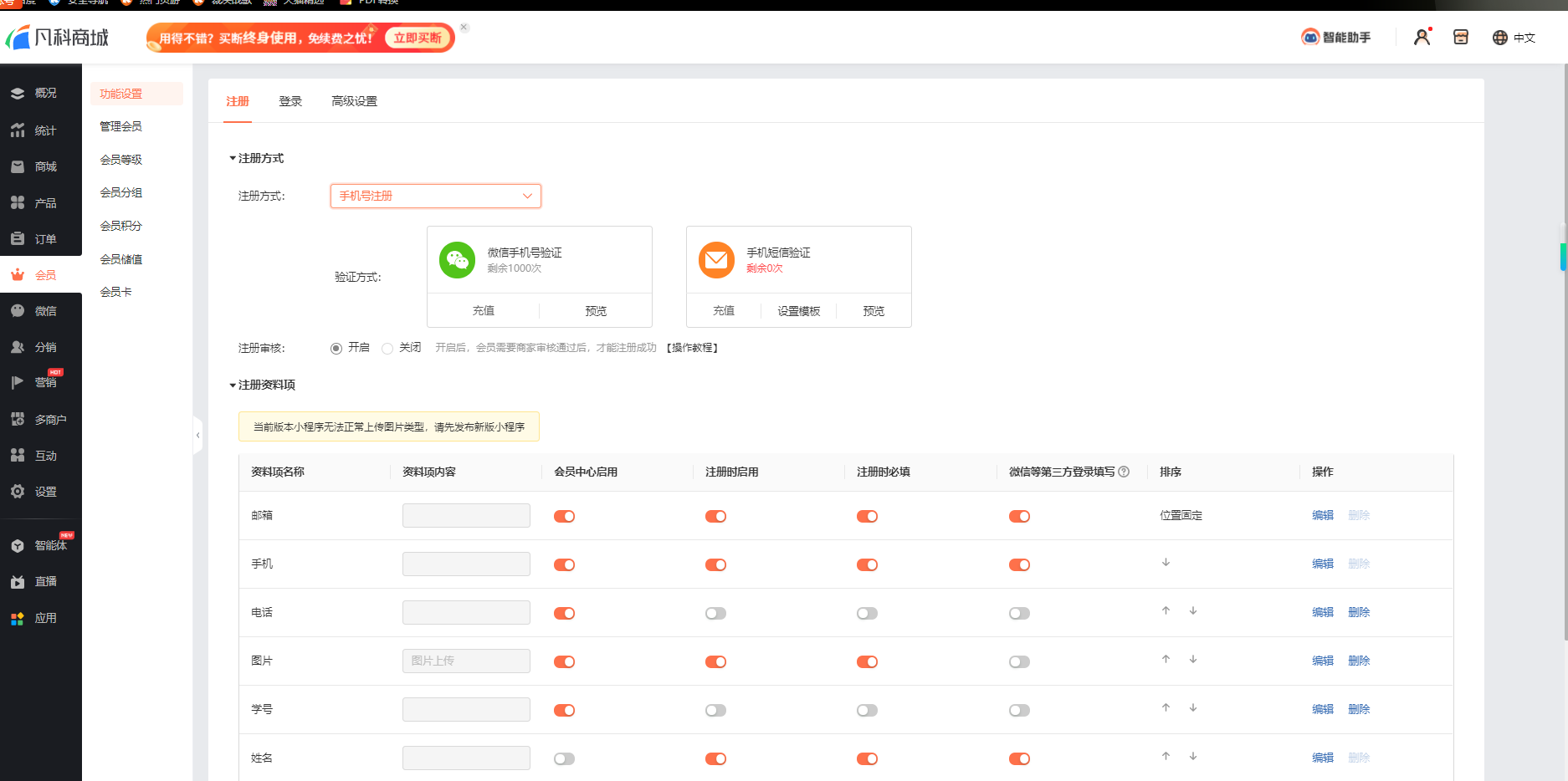 每种注册方式都有着不同的资料选项,商城企业可以设置用户在注册会员时所需要填写的资料项目,更加精准地收集客户的信息。