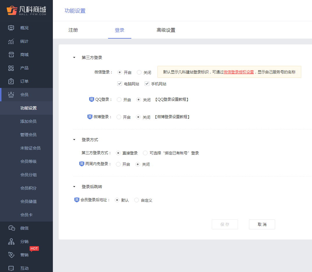 首先我们需要进入凡科商城后台,随后在左侧边栏依次点击“会员-功能设置-登录-第三方登录”找到第三方账号登录设置。