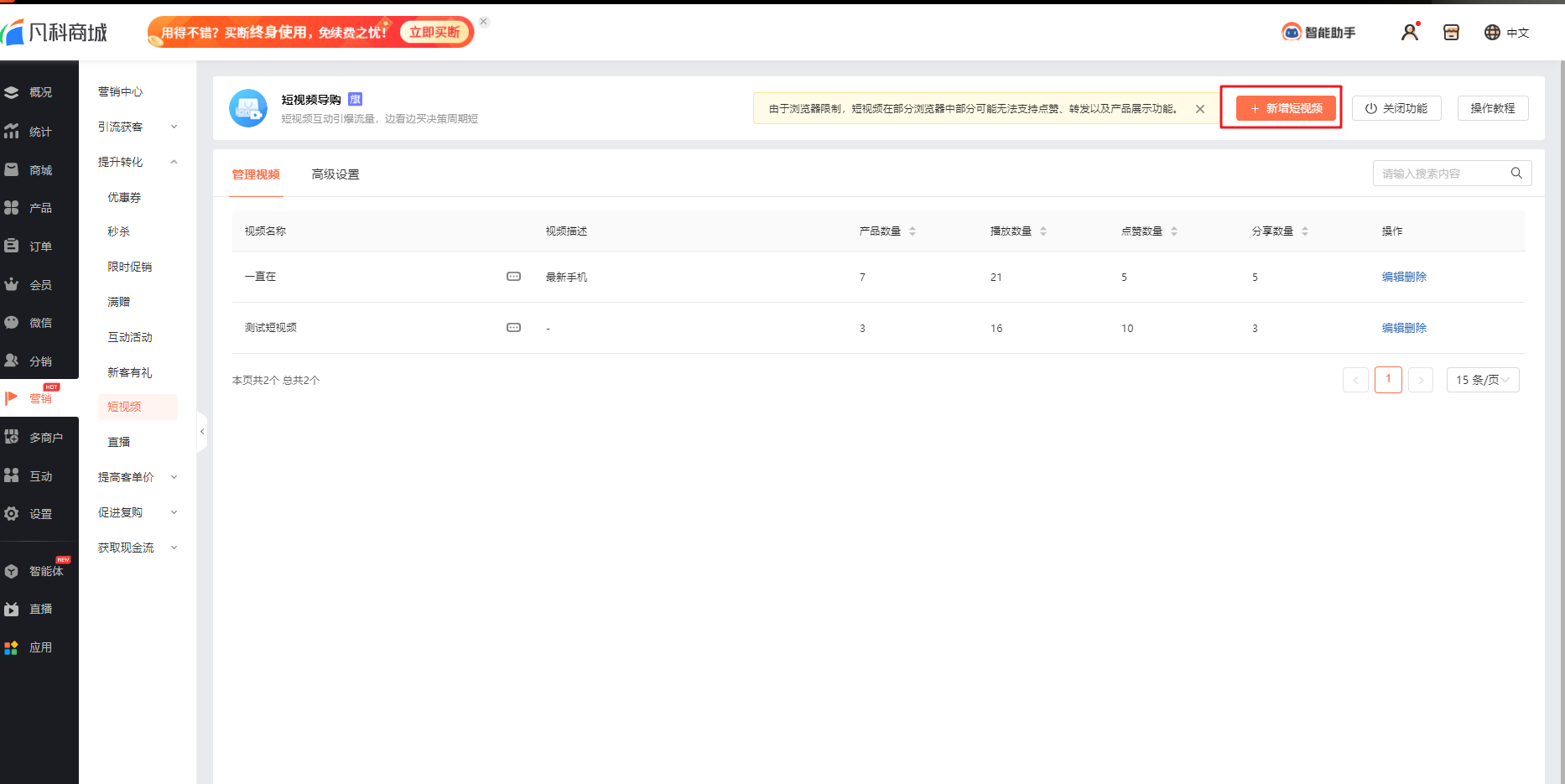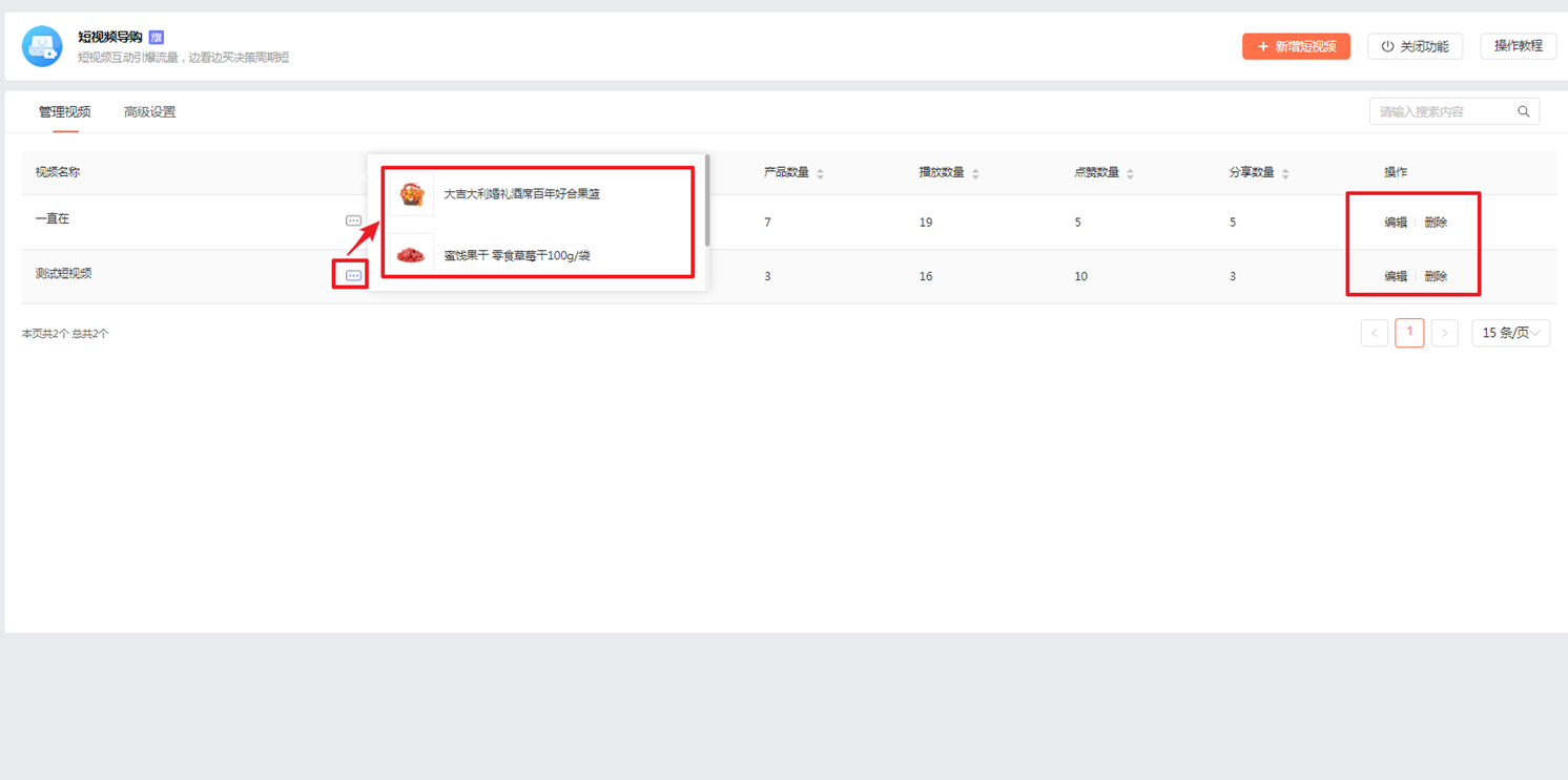 展示所有已添加的视频,支持对视频进行“编辑、删除”操作,同时,也可查看看活动产品的缩略图。