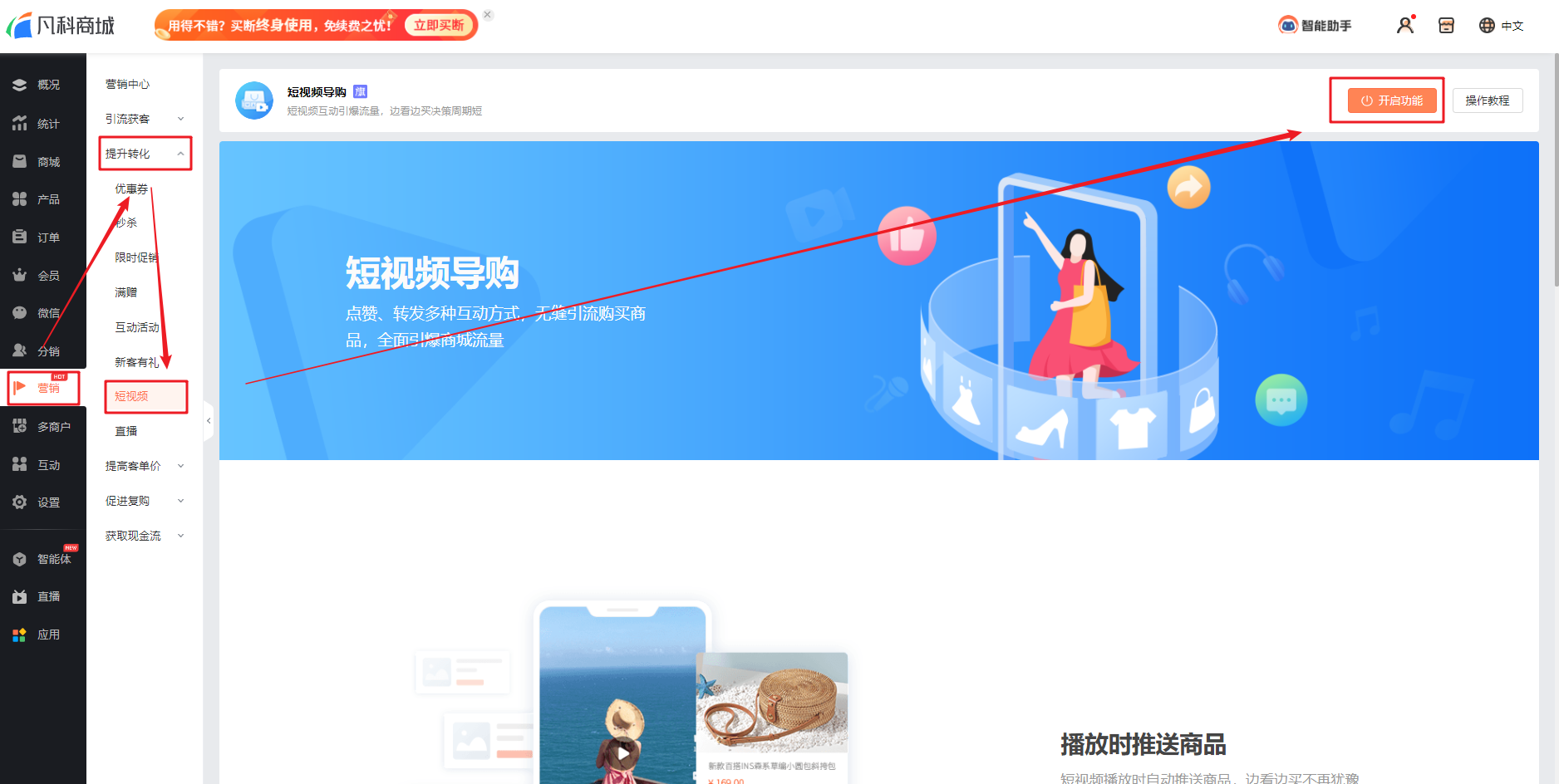 进入【商城管理-营销-提升转化-短视频导购】中,可开启短视频导购功能。