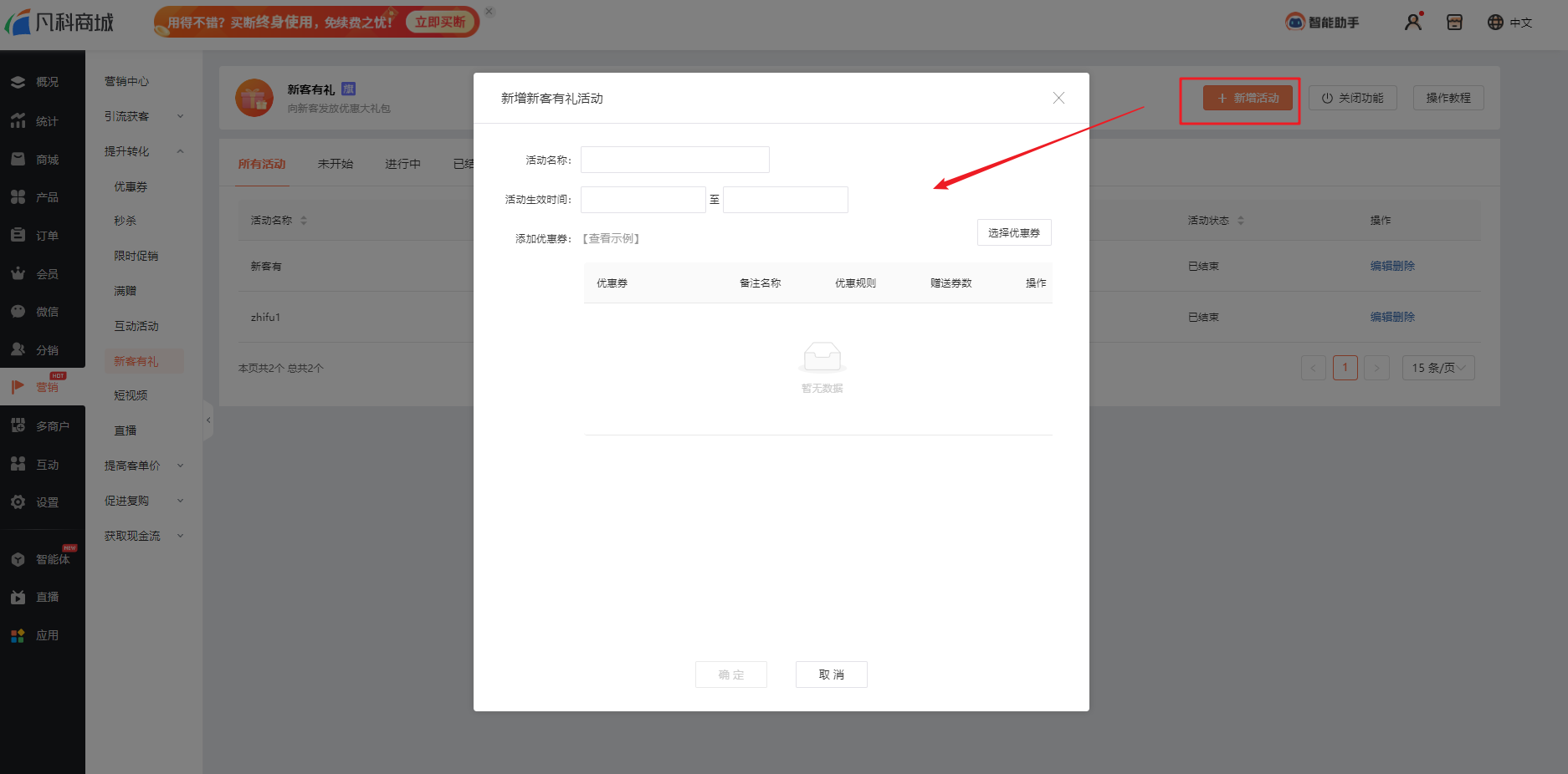 新客有礼营销活动是面向新注册用户,是一种有助于商家拉新新的营销活动。商家可以在凡科商城后台添加优惠券和活动时间,然后在买家端页面会弹出新客有礼的窗口,系统自动识别新客后,为其发放优惠券。该活动同时支持手机网站和小程序。