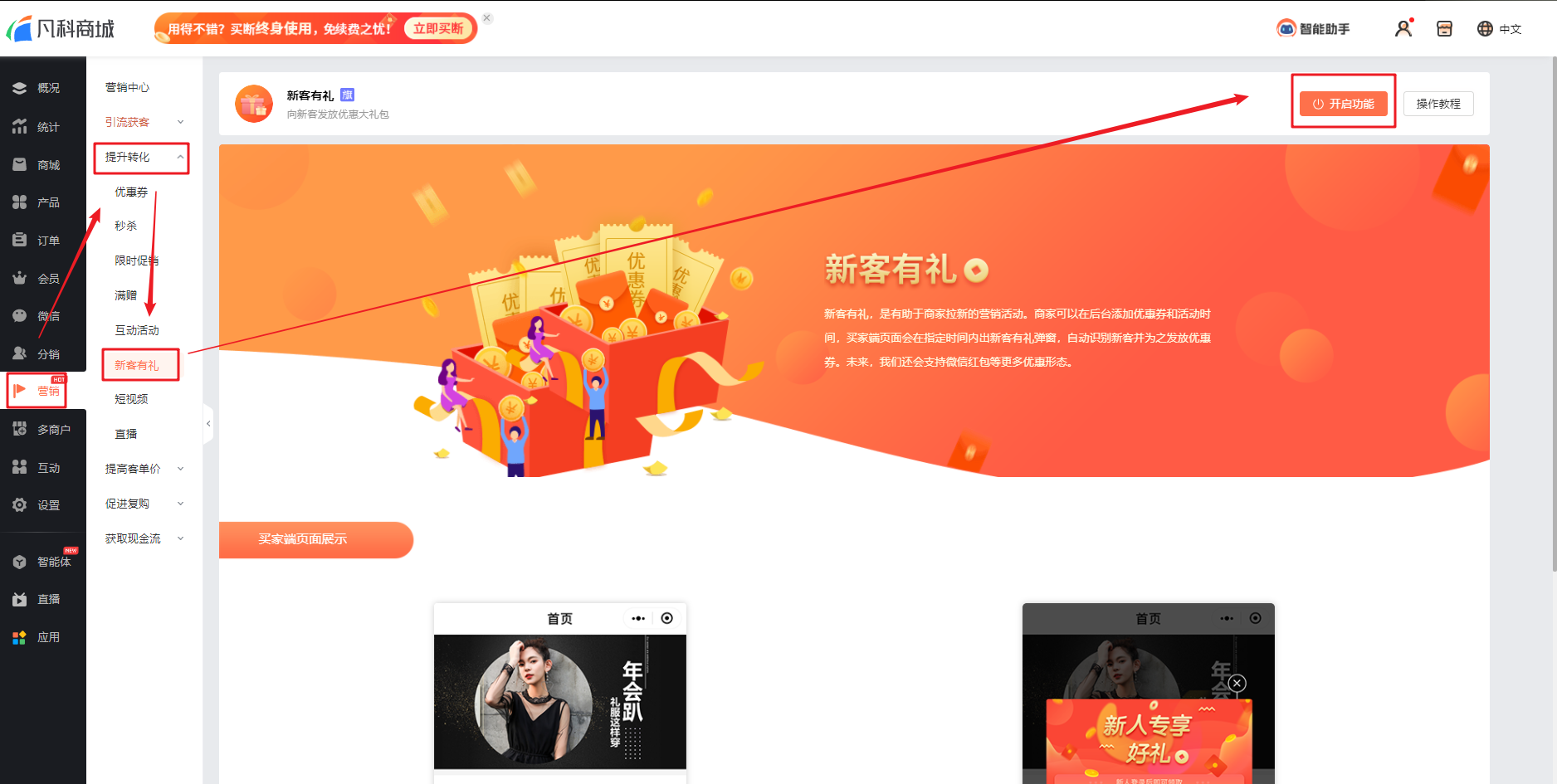 进入凡科商城后台系统,进入【营销--提升转化--新客有礼】,后开启【功能状态】即可。