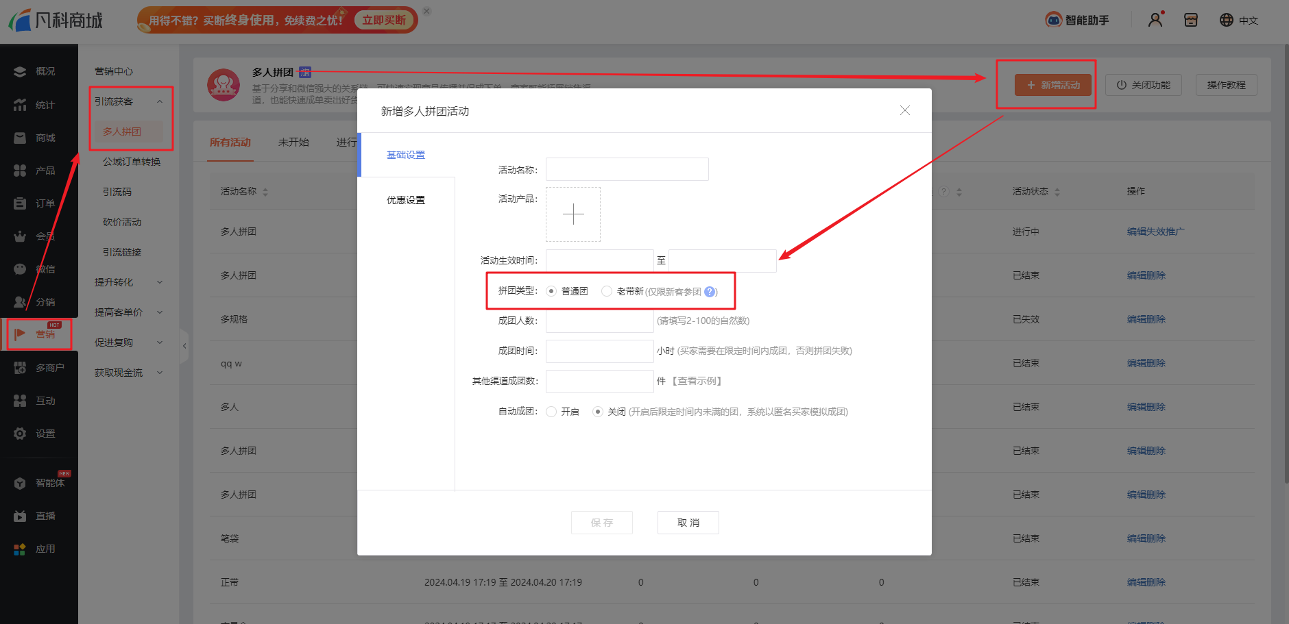 在新增拼团活动时,可以在拼团类型中选择老带新的类型。