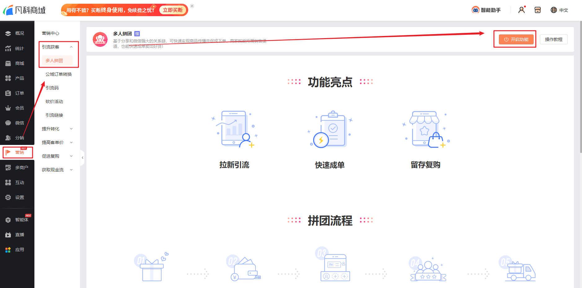 在商城管理后台点击【营销-引流获客-多人拼团】开启功能。