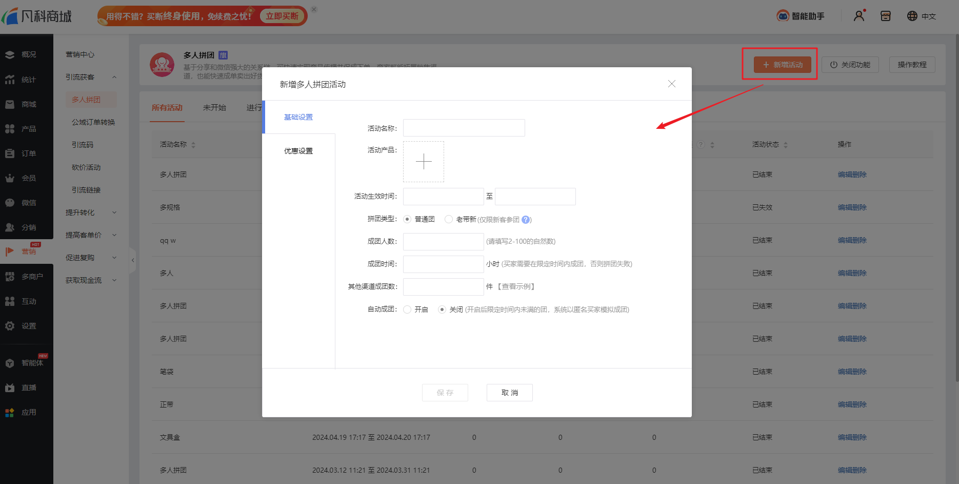 商家进入【商城管理后台-营销-引流获客-多人拼团】中,开启功能,点击“新增活动”按钮,在弹窗内填写相应活动信息,即可创建多人拼团活动。