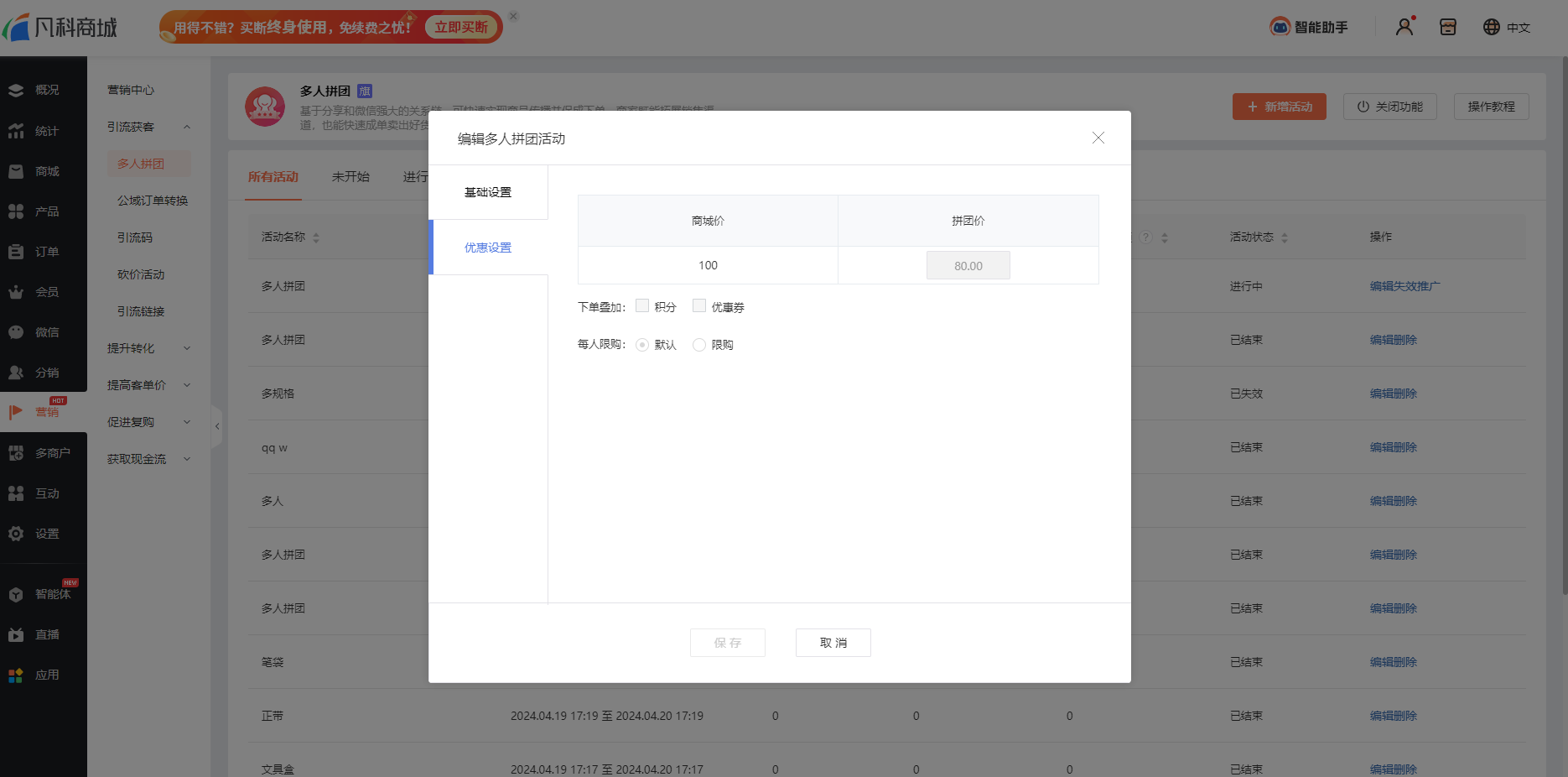 - 拼团活动支持下单叠加会员积分、优惠券。支持设置每人限购量。