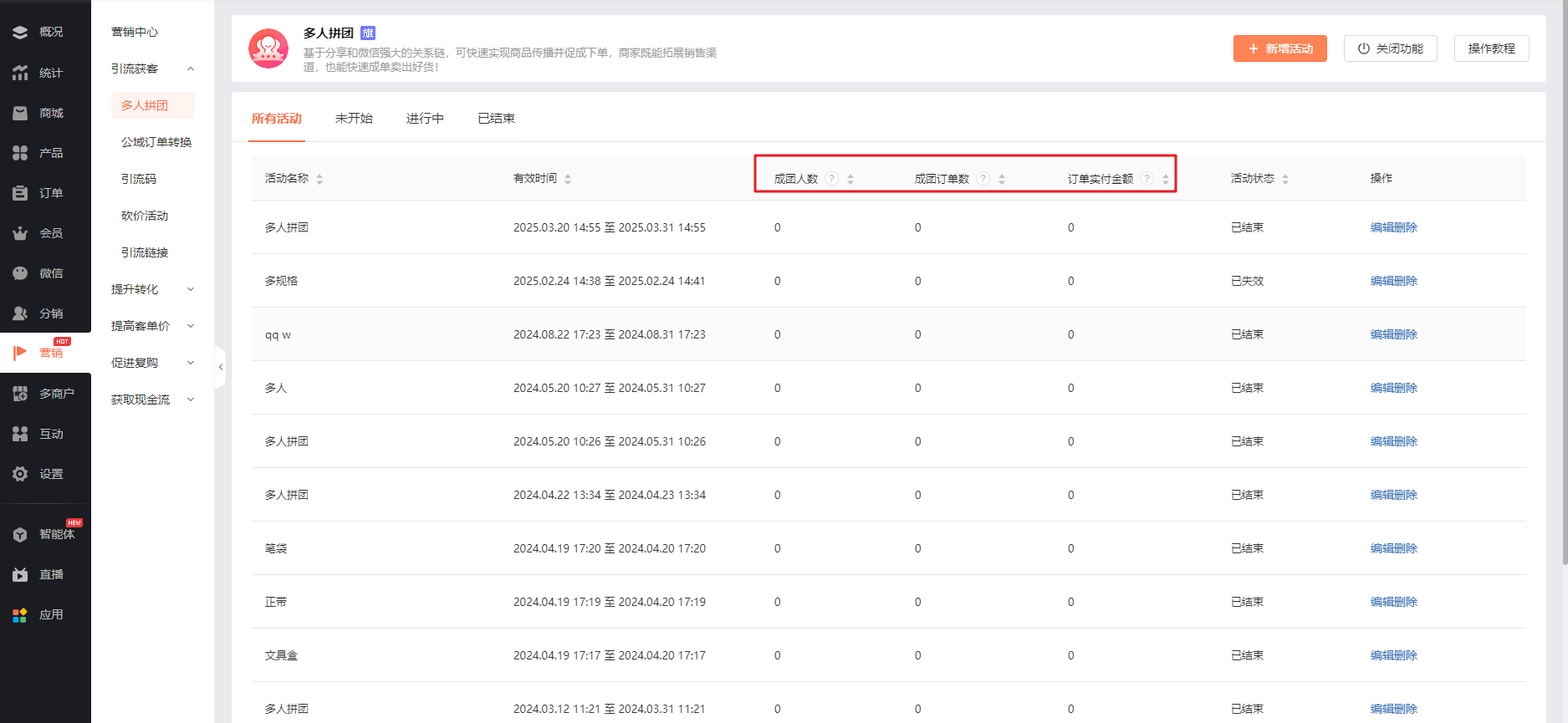 支持商家查看活动成团人数、成团订单数、订单实付金额等数据,便于了解活动成效。