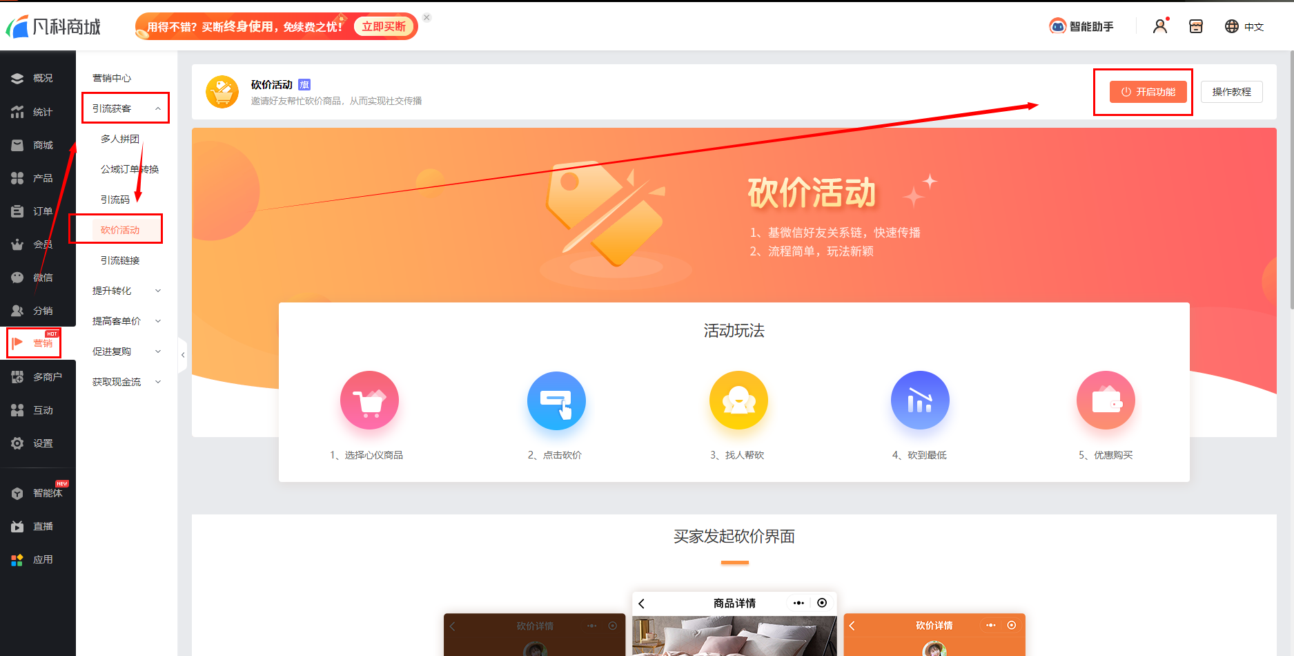 商家进入商城管理后台【营销-引流获客-砍价活动】中,可开启砍价活动功能。