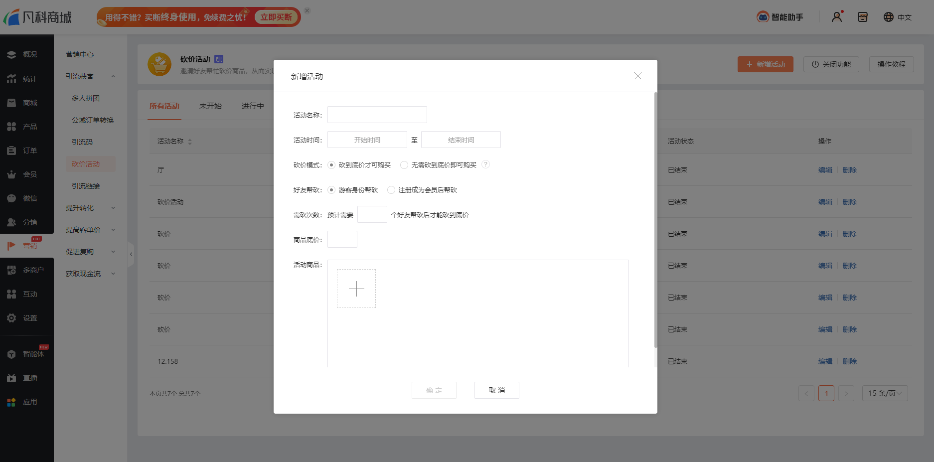 开启功能后,点击“新增活动”按钮,在弹窗内填写活动信息,即可创建砍价活动。