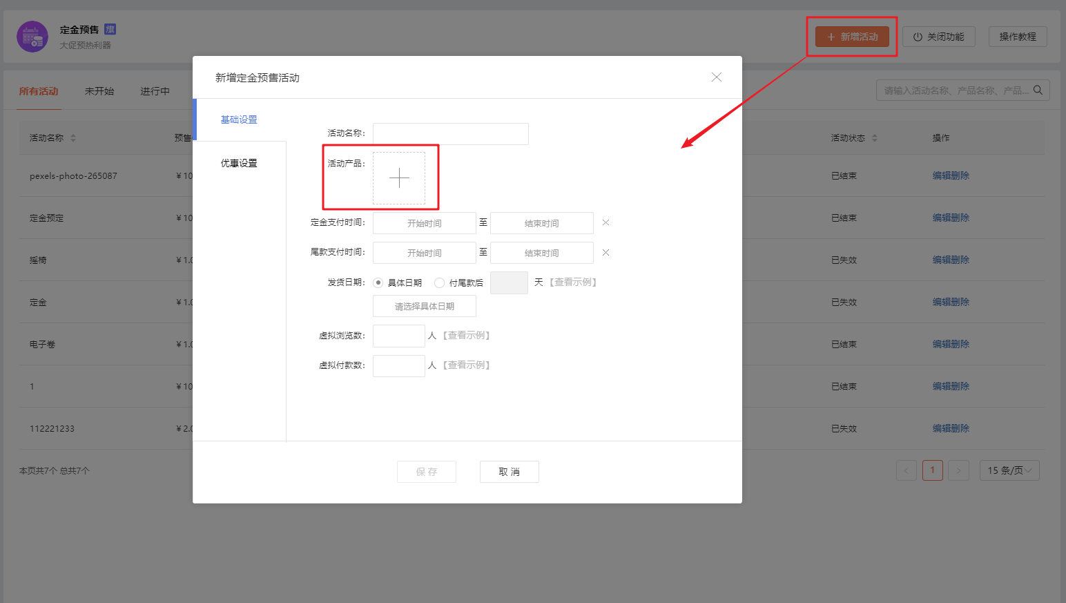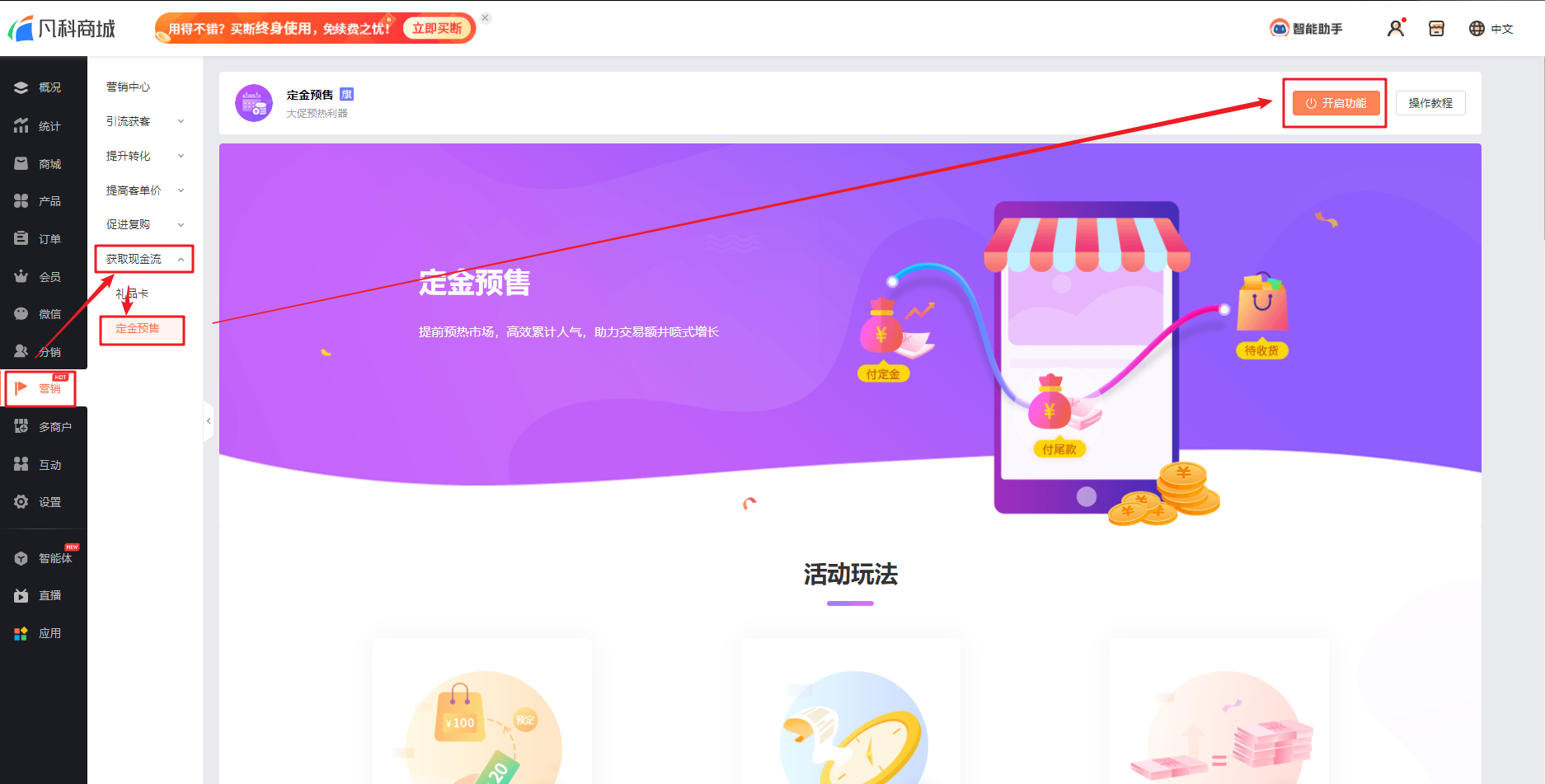 可进入【商城管理-营销-获取现金流-定金预售】,设置定金预售营销活动。