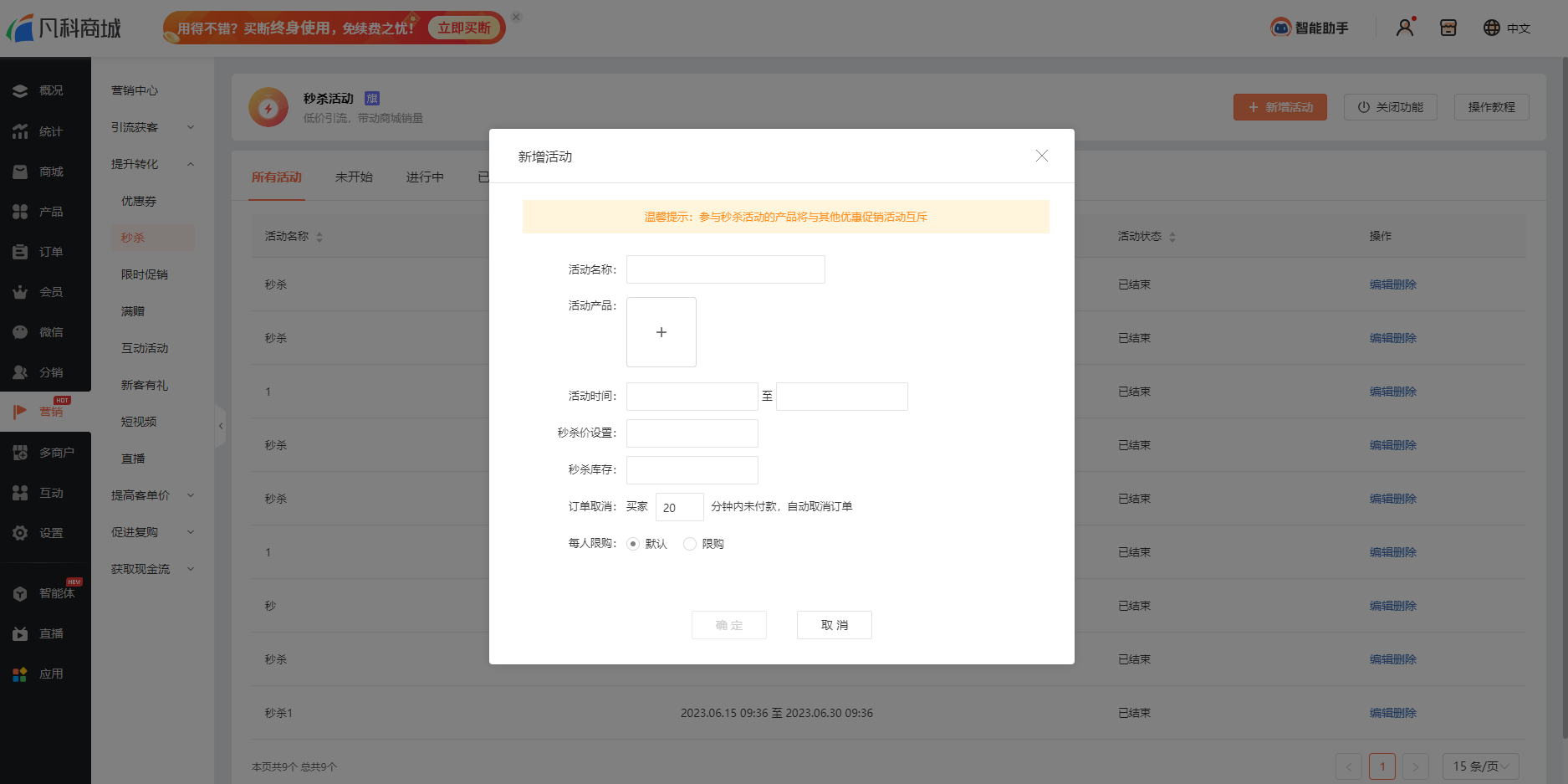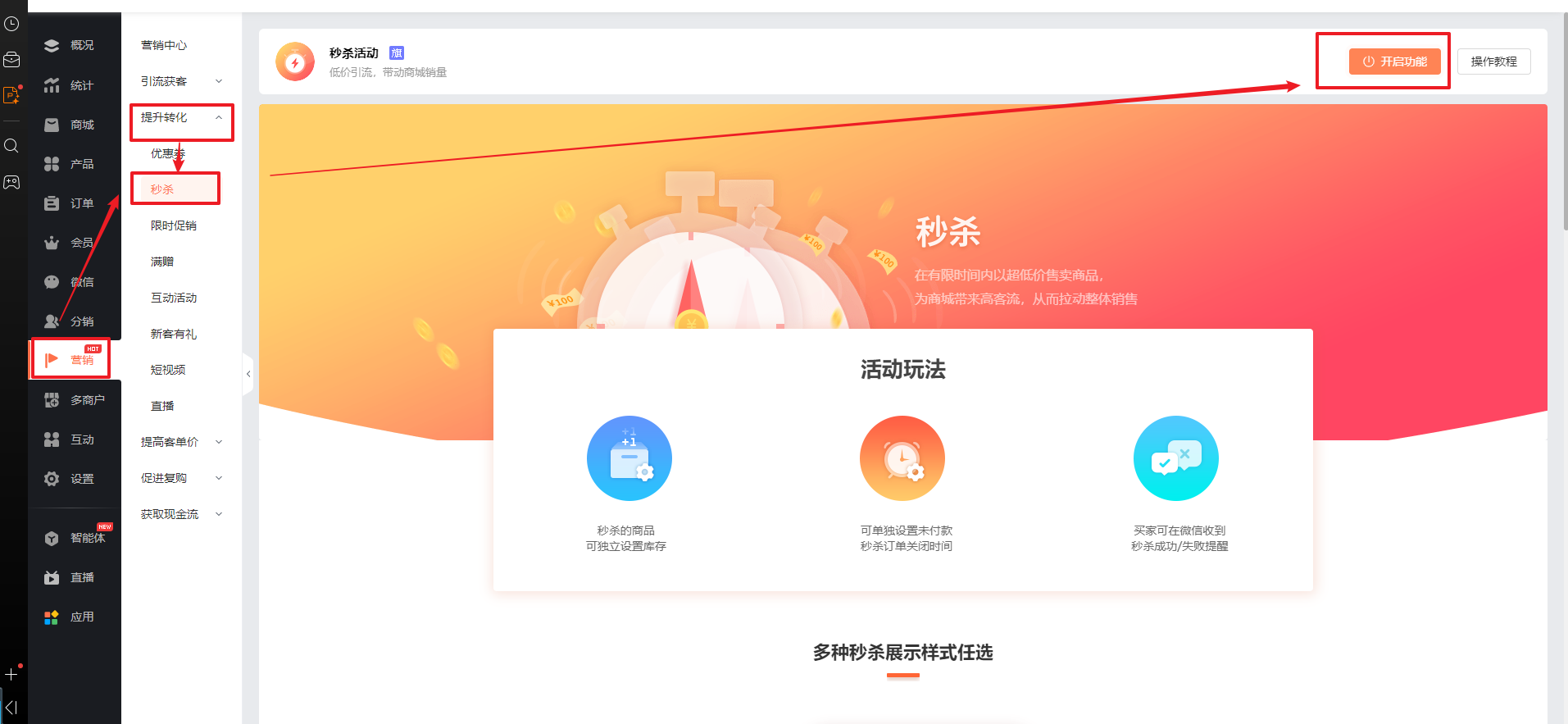 秒杀活动是拉新促销,提升购买率的营销活动,商家可结合活动前预热的措施拉新促活,引导客户在有限的时间内完成超低价的抢购。对比其他的营销活动,秒杀限时性更强,抢购氛围更浓,可营造出一种不是所有人都能抢到的刺激感。