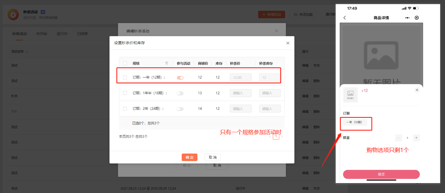 注:秒杀按规格设置秒杀价功能,一个产品存在多种规格时,只有参与活动的规格会在前端展示,例如:只有一个规格参与活动,则前端只看到一个规格。