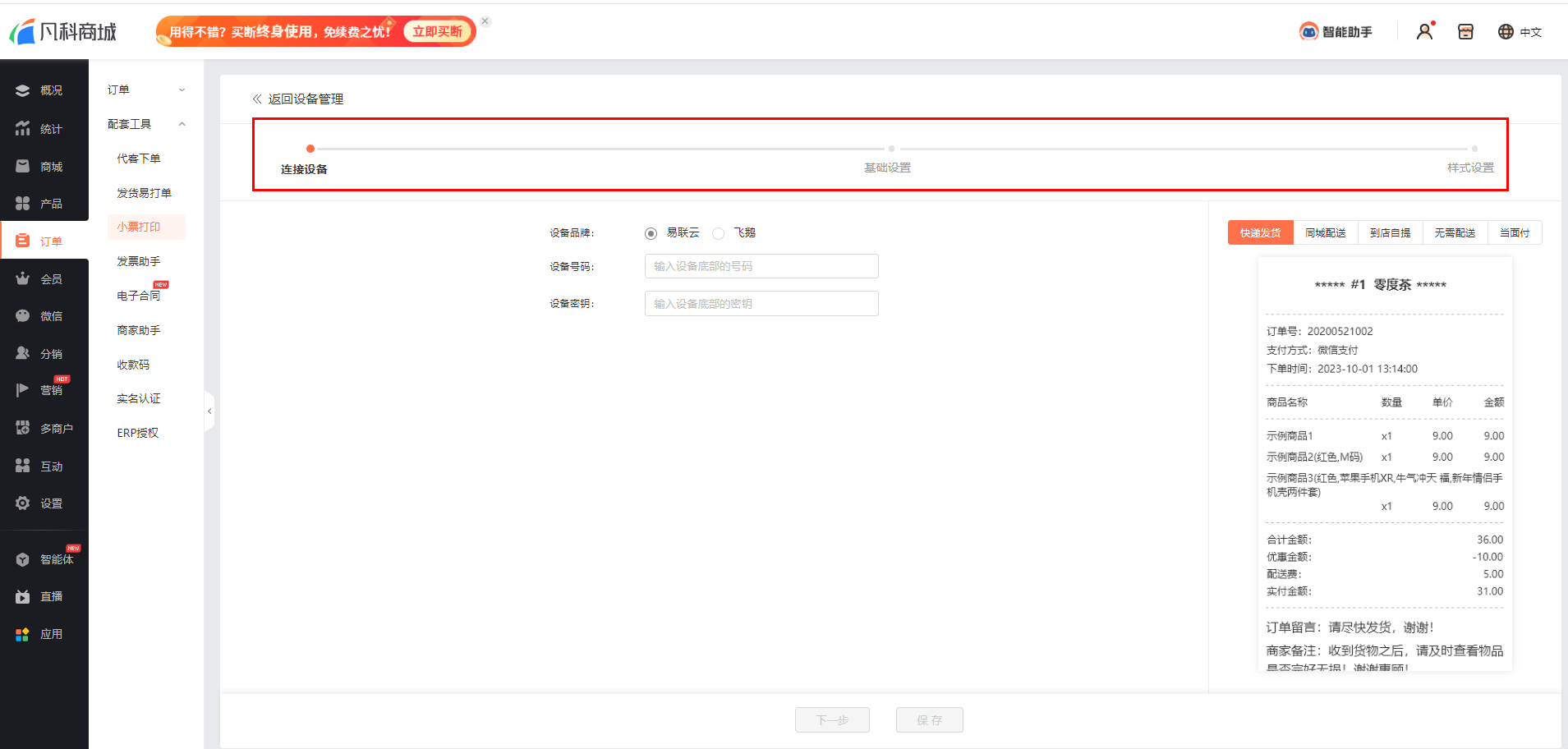 先按照下文设置教程,在凡科商城完成易联云打印机的接入与绑定;