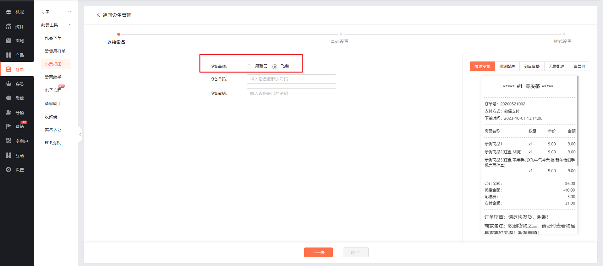 商家可进入「商城管理后台-订单-配套工具-小票打印机」中添加打印机设备。可选择易联云 / 飞鹅打印机进行配置: