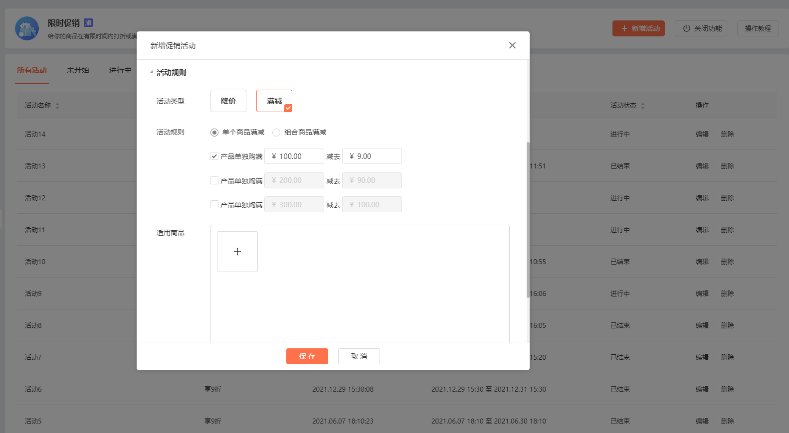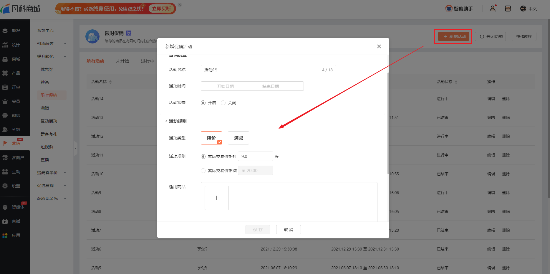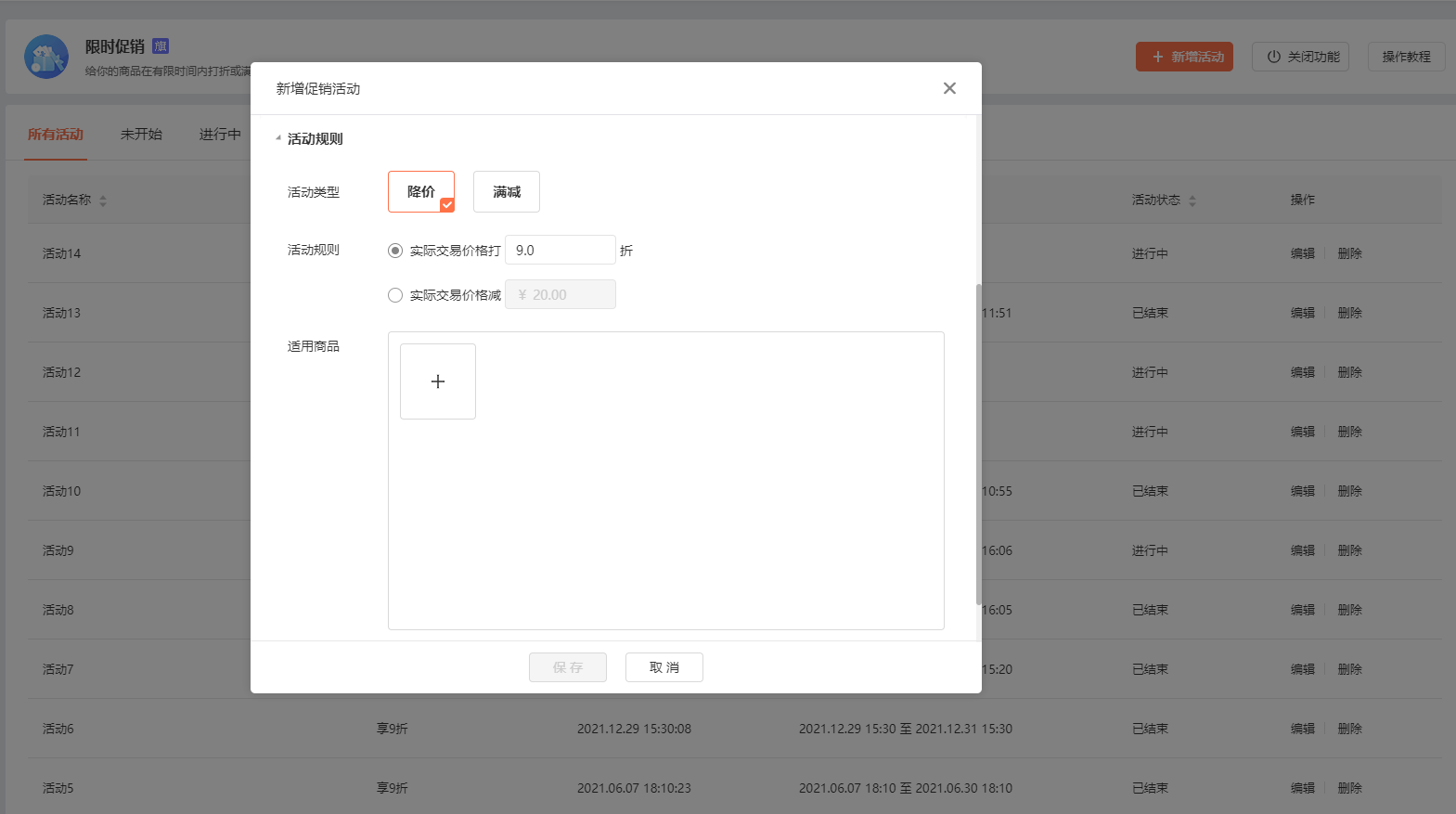 点击【新增活动】添加促销活动,支持设置降价或满减规则。