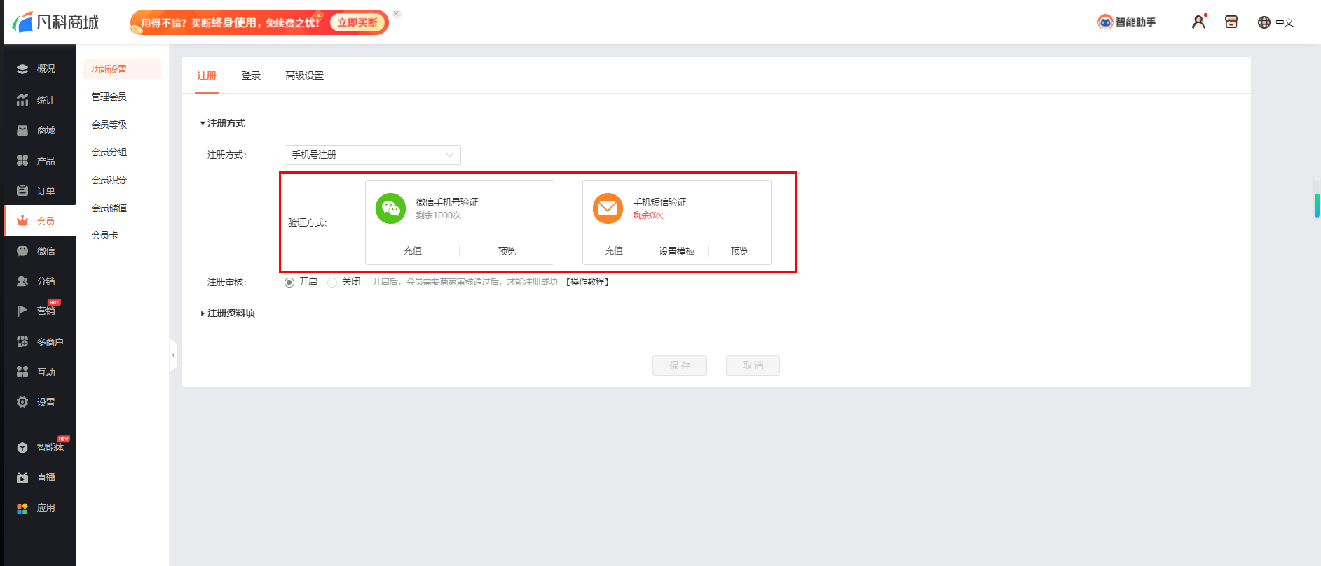 手机短信验证:商家确认已充值并所设置模板已通过审核,才确保能发验证码到用户手机。
