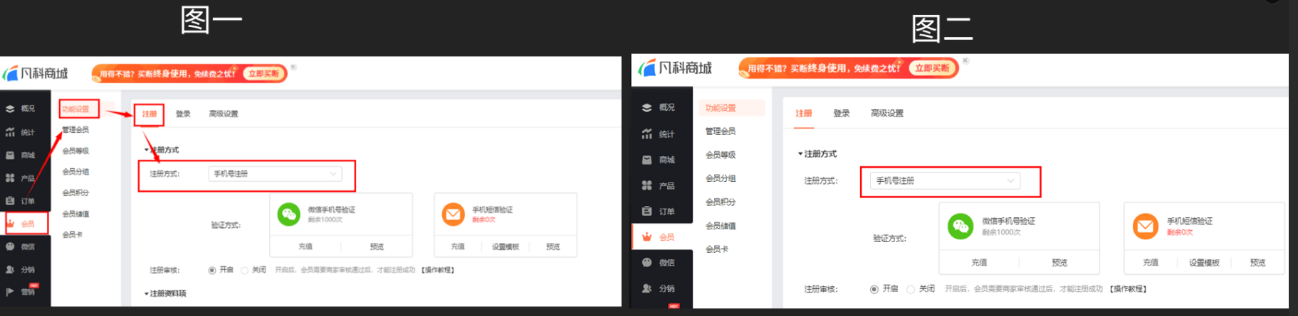 进入网站后台 → 找到【会员-注册设置】→ 将注册方式改为「手机号注册」(支持手机短信验证和微信手机号授权验证)(参考图一示例)。