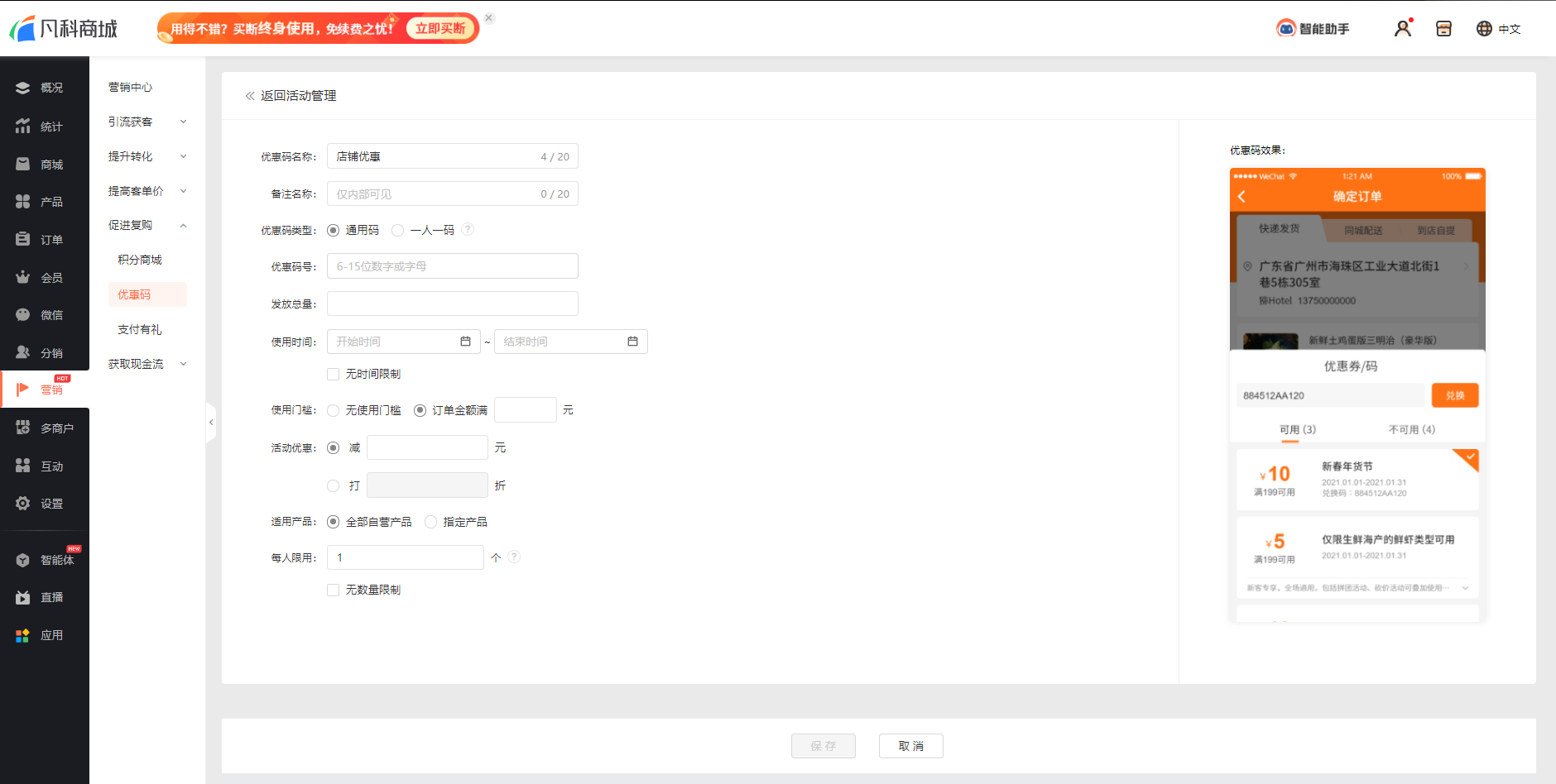 如需购买子商户产品时使用,优惠码活动创建时可指定子商户产品。(砍价、秒杀除外,砍价和秒杀的订单不支持使用会员积分和优惠券/优惠码的)
