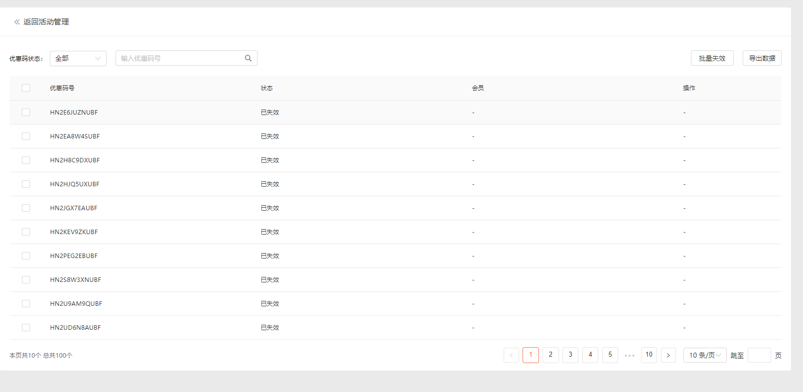 ④ 优惠码列表:可查看优惠码的详细信息,对于已兑换和已使用优惠码,可以看到对应的会员名称,对于未兑换的优惠码,可以做失效处理。因为通用码所有的码值是一致的,所以不展示未兑换的通用码信息,不能做单个通用码的失效处理。