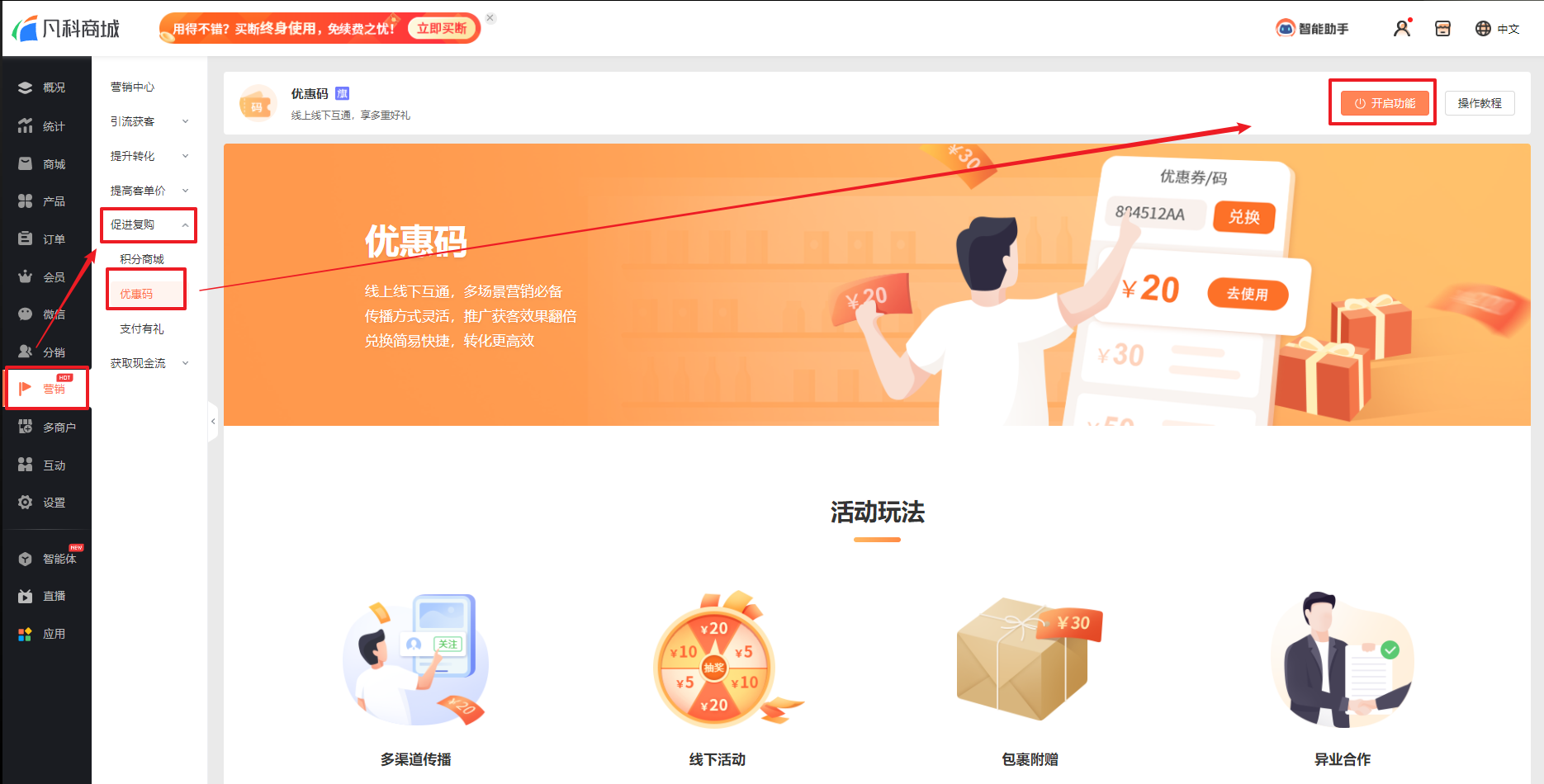 在商城管理后台【营销-促进复购-优惠码】中开启功能。