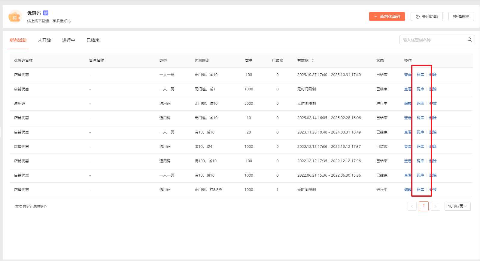 ② 码库:点击查看优惠码的码值信息,可在码库页面内导出优惠码信息。