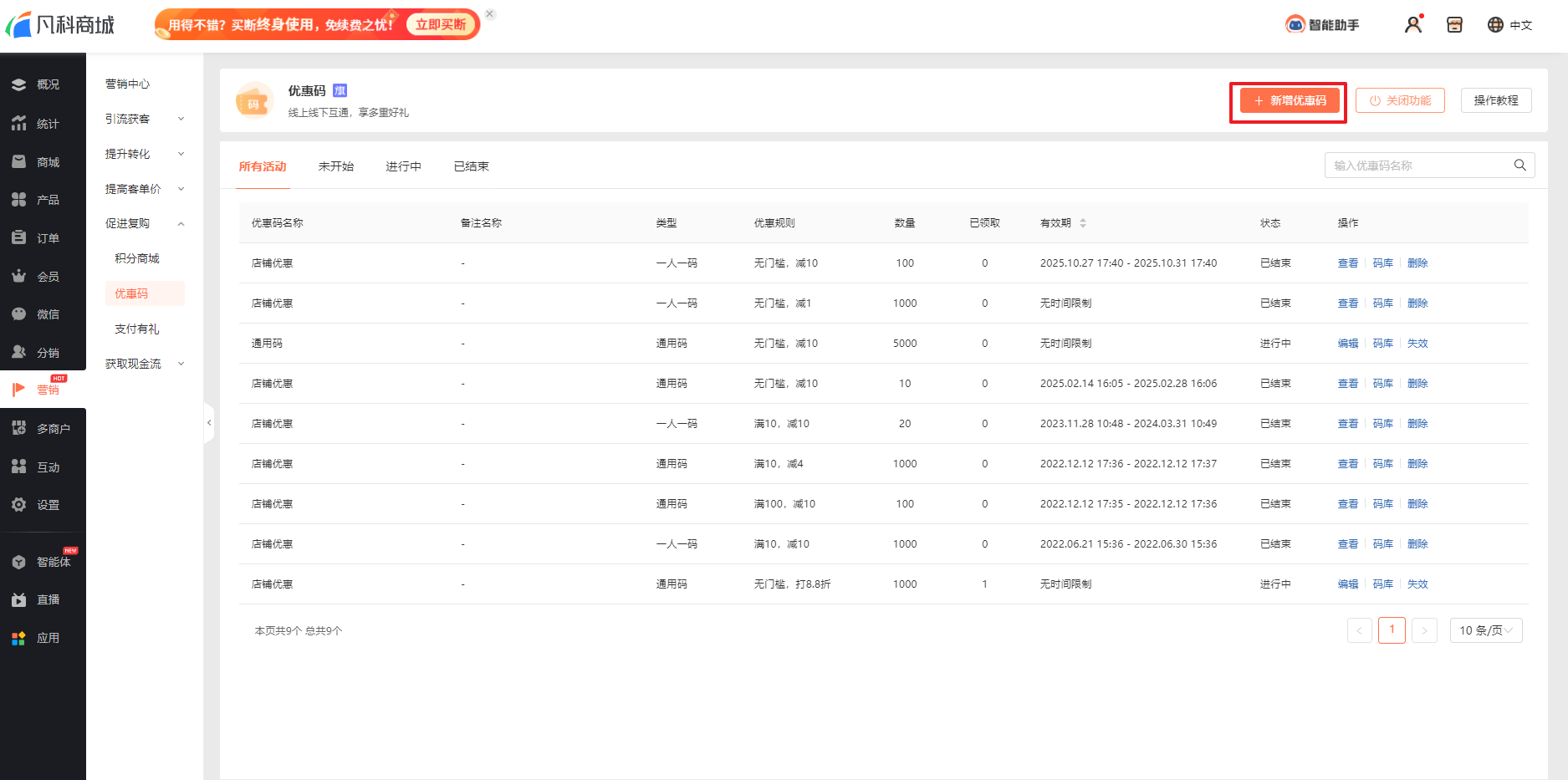 ③ 失效:点击失效,则该优惠码活动失效,未兑换的优惠码不可进行兑换,已兑换为优惠券的可以继续使用,不受失效影响。