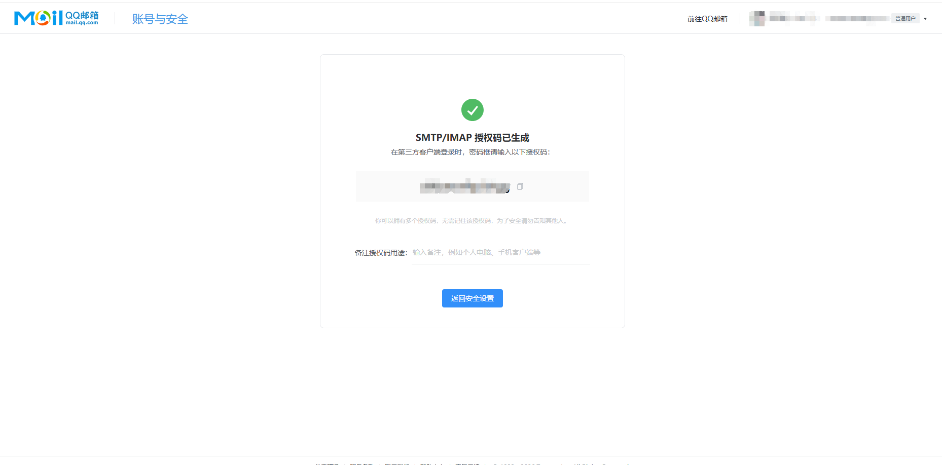 3.3 短信验证完成后会在弹窗弹出授权码,复制授权码粘贴到商城管理后台需要填写SMTP授权码位置即可。